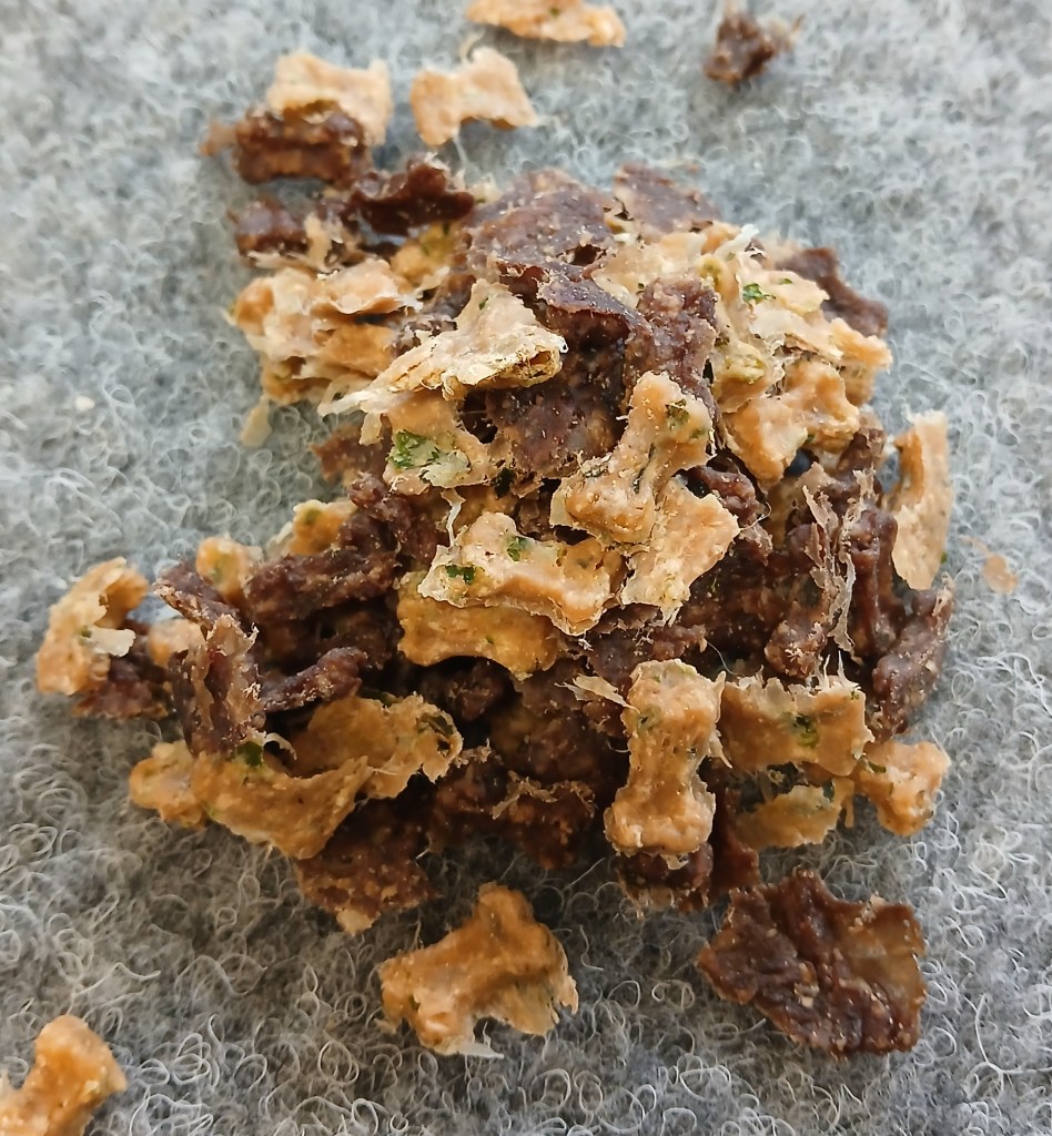 Smeta ut i godisformar av silicon, (finns att köpa i ex. zoo-affärer eller online) de jag har är formade som små hundben. Om man inte har formar kan man breda ut smeten på remsor av bakplåtspapper. Anpassa remsorna efter torkbrickornas storlek, men tänk på att luften behöver kunna cirkulera mellan remsorna.